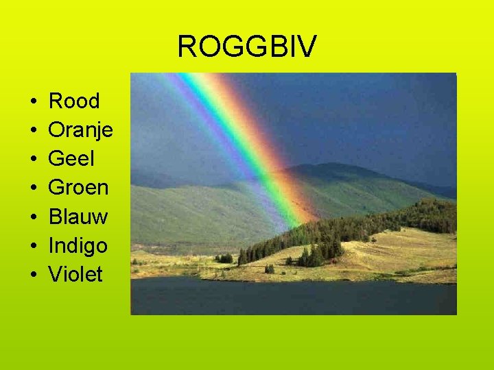Roy G Biv (engels y = yellow) ROGGeBrood Is Vies. Uitleg. Volgorde van de kleuren van de regenboog / het spectrum: De hoofdletters staan voor de kleuren: Rood, Oranje, Geel, Groen, Blauw, Indigo, Violet. Soms zie je een tweede regenboog, zwakker en groter. De volgorde van die regenboog is andersom, VIBGGOR!!! Meer over de regenboog op Wikipedia.